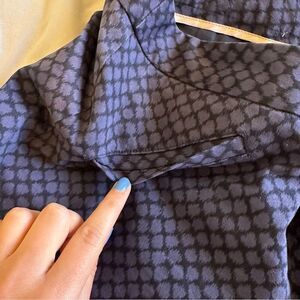 Fun, classy, and easy to dress up or down patterned dark blue trousers from Gap. These trousers feature a subtle design detail with black interspersed, a clasp and zipper front closure, and four pockets between the front and the back. These trousers are in like new condition, you can see in the fourth picture that the pockets haven’t even been ripped open yet. Size 8 and “ultra skinny,” but they do have stretch as noted on the label.