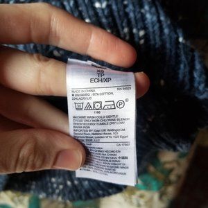 Gorgeous knit sweater from Gap. Off the shoulder styling with ribbed collar, hem, and cuffs. Yarn is a mixture of dark blue, light blue, and white. Perfect for winter.