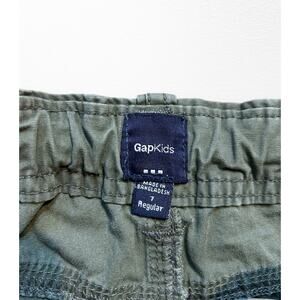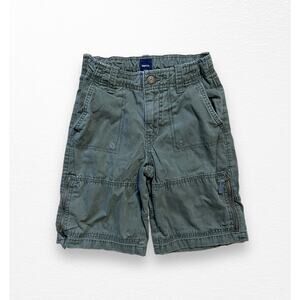 Olive green baggy bermuda-length cargo shorts from Gap Kids in size 7. Zipper and snap closure, inner adjustable waist, pockets galore including back pockets with velcro tab closures.