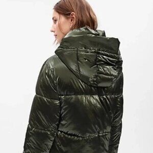 New with tags, never worn shiny olive green parka puffer jacket with hood.