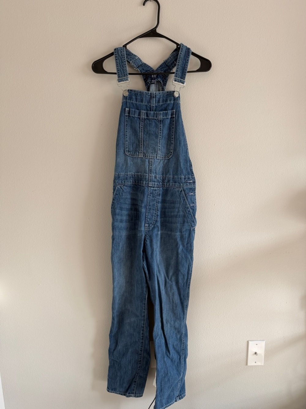 Classic blue denim overalls with front bib pocket and adjustable straps. Straight leg silhouette. Casual everyday staple.