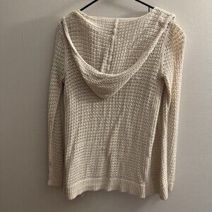 This cardigan features long sleeves, a hood, and an open-weave knit style that adds a unique touch to its design