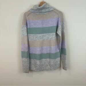 Stay cozy and stylish with this striped turtleneck sweater. Featuring a blend of gray, purple, and green, it's perfect for any casual outing. Enjoy the soft, comfortable fit all season long.
