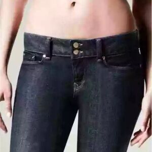 * These Gap Perfect Boot jeans are made of a dark wash stretch denim and have a mid-rise fit.