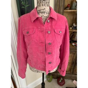 Gap Women’s Pink Corduroy Jacket in medium. Good looking jacket. • Front button closure • Two chest pockets, one inside and two side pockets • Adjustable waistband buttons • Long sleeves with buttoned cuffs. Good condition