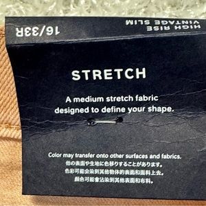 Gap High Rise Vintage Slim Size 16/33R Stretch, Fitted Through the Hip & Thigh Straight Leg Hits The Ankle The button is missing and there is a couple spots that look like dust marks from store. Pretty sure if you wash them it will come right out A01