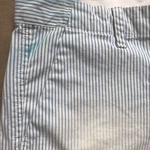 Gap blue and white pinstriped shorts with faded pockets. These a boyfriend fit, but snug enough in the waist. I’m typically a size 4 but Gap tends to run big so these are a size 2. There is a tiny bit of blue color transfer on the side of the shorts, see the last picture for details. Great little shorts and Gap makes clothes to last so you can get a lot of wear out of these!