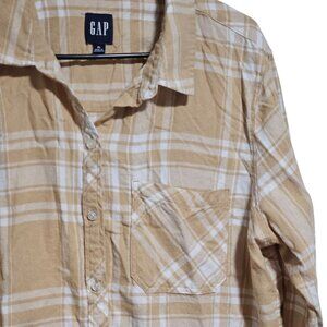 A stylish and versatile plaid button-down shirt by Gap, designed for comfort with its soft cotton material. Its beige color and relaxed fit make it a timeless piece suitable for various casual occasions.