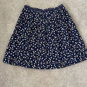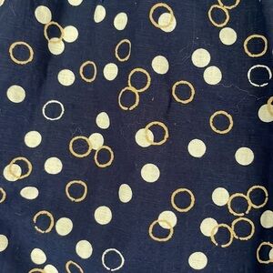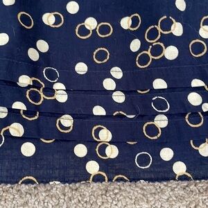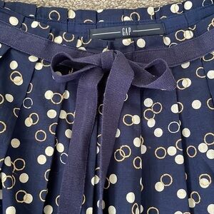 Gap pleated full skirt. Decretive tie in front, side hidden zipper, pleats around top of skirt. Excellent condition, no stains or tears. Navy print with cream and gold circles. So cute. 100% cotton lined inside. Gap size 2, actually a Size 10, waist 15”, length 21”.