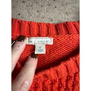 Women’s Gap cable knit sweater in poppy red/orange, size Large. 100% cotton with a traditional fisherman pattern. Classic crewneck with ribbed cuffs and hem. Perfect for layering with jeans or leggings.