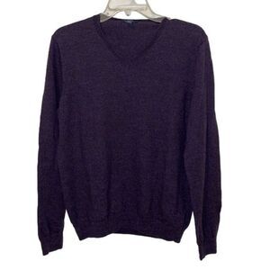 Heathered purple, 100% extra fine merino wool, pullover, v-neck, long sleeve, sweater by GAP in a men's size large. Approximate measurements shown in photos. Great closet staple sweater for Fall and Winter. In very good pre-owned condition with minor signs of wear from normal use.