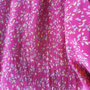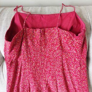 Fun Raspberry floral spaghetti strap dress. Hook and zip closure in the back. Slight ruffle hem at the bottom. Slim fitting dress. EUC. See pictures for fabric content and care instructions.