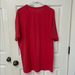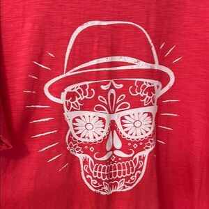 Bold red tee featuring a stylish skull graphic. Perfect for casual wear. Soft and comfortable fabric. Hundred percent cotton.