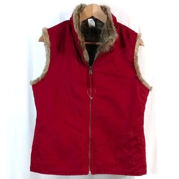 Excellent condition, new without paper tag (still had the plastic loop, though!). Rich red zip-up vest that is lined with faux fur. Front slash pockets on red side. Reversible for switching up your look!