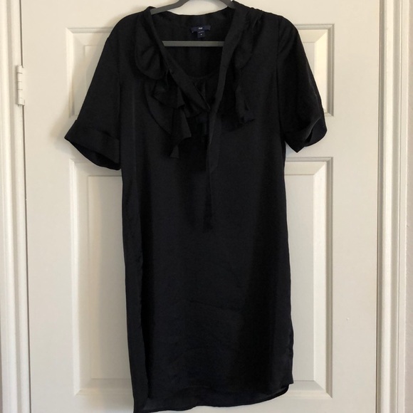 Black shift dress with ruffle detail along neckline and optional tie. Fully lined. Excellent condition