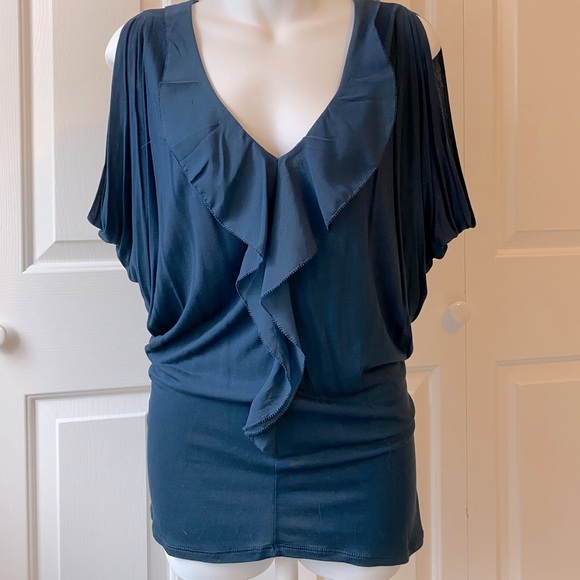 Attractive mixed media top with v-neck and ruffle detail. Short, draped sleeves. Fitted around the hips and loose on top.