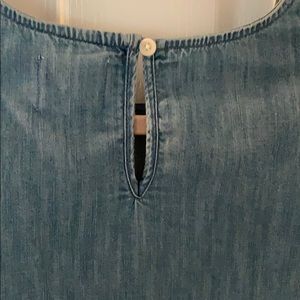 This top is a beautiful blue denim imitation. With ruffled sleeves and a keyhole button, this top has many dainty details.