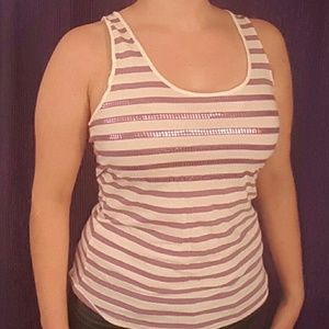This sequin tank is very stylish and lightweight for the summer. It has purple stripes across the body, with sequin accents across the chest. This can be easily dressed up or down to fit the occasion.