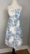 This elegant summer dress showcases a classic white and blue floral pattern with a lightweight cotton/silk blend shell.