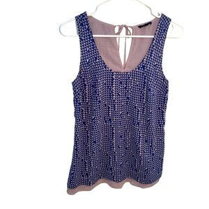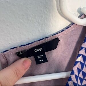 Great condition. Gap. sleeveless blouse. Scoop neck. Blue with purple and cream triangle geometric pattern. Keyhole back with tie and button closure. Size XS. 100% polyester. Pit to pit laying flat 17” Shoulder to hem 25.5”. All measurements are approximate and taken lying flat. Smoke free home. No trades, offers welcome.