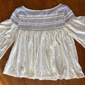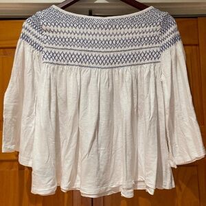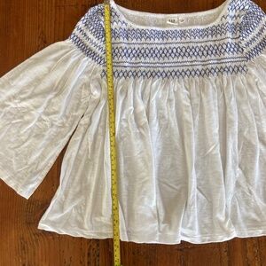 Cute bell sleeve swing top. Boho smocked blue stitch on a white shirt. Gap size small, 3/4 sleeve. Great preowned condition. Measurements are approximate