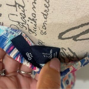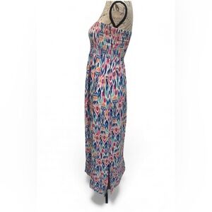 Beautiful and vibrant Gap maxi dress in a multicolor ikat print. Features a strapless design with a smocked elastic bodice that stays in place, a flowy rayon skirt, and side slits for added comfort and movement. Perfect for summer outings, vacations, or casual wear.