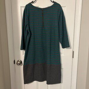Teal and gray striped dress with gray color block bottom. Polyester lining underneath.
