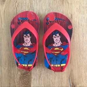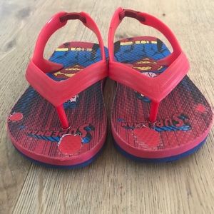 Red D.C. Superhero flip flop sandals. GUC - wear to graphic at big toe. Molded footbed with