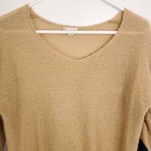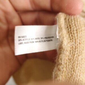 This is a classic brown pullover sweater from Gap designed for women in size small. The sweater features a solid knit fabric made of polyester, wool, and acrylic, ideal for the winter, fall, and spring seasons. It has a crew neck, long sleeves, and a regular fit, making it suitable for casual and workwear occasions. This lightweight sweater should be hand washed to maintain its quality. The garment is not vintage and does not offer personalization options.