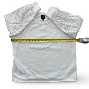 Perfect for spring, lightweight, white sweatshirt. Rolled hem and 3/4 length eyelet sleeves. Worn once. Please see photos for measurements and fabric details.