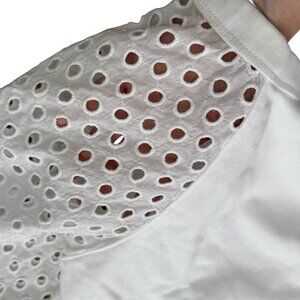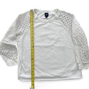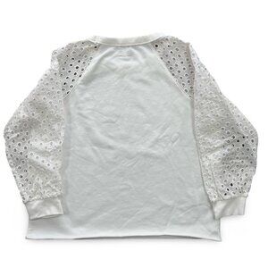 Perfect for spring, lightweight, white sweatshirt. Rolled hem and 3/4 length eyelet sleeves. Worn once. Please see photos for measurements and fabric details.