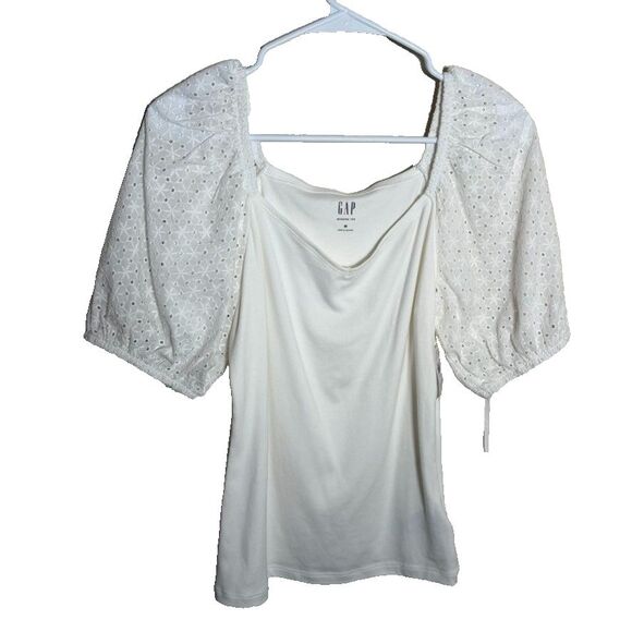 Gap T-Shirt Women's Medium Modern Tee Puff Sleeve Eyelet Boho Tie Casual NWT