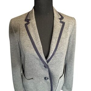 Chic and timeless Gap Academy Blazer in heather gray with navy trim detailing—perfect blend of comfort and polish. Ideal for workwear, teacher outfits, business casual looks, or stylish everyday layering. Soft stretch fabric offers comfort with a tailored silhouette.