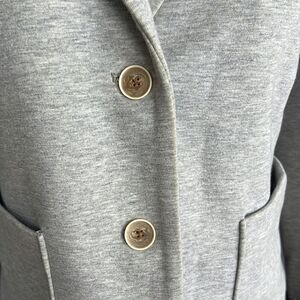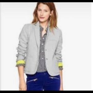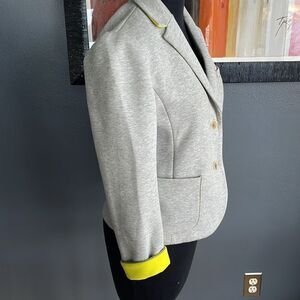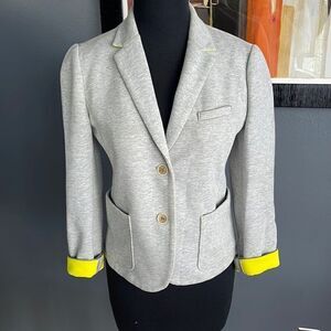 Gap The Academy Boy blazer. Heather gray knit. Chartreuse cuffs. Notched lapel. Lower front pockets. Left chest small welted pocket. Princess seams. 2 button front. Cotton/polyester/spandex blend. Size 0. Excellent condition. Nonsmoking home. E