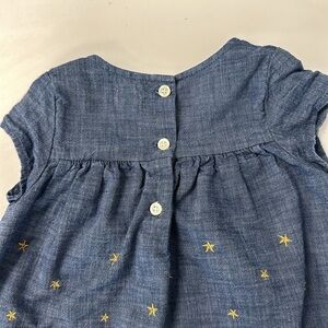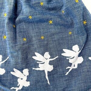 Lightweight chambray style denim dress. Fairies printed along the bottom with gold embroidered stars. Lined for extra comfort, buttons up the back. Super cute as a casual dress or easy to wear to an event. Excellent condition from a smoke free home