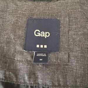 Cozy and warm Gap puffer coat featuring a full zip closure with toggle button accents, faux fur trimmed hood, and side zip pockets. Perfect for cold weather layering and casual winter wear.