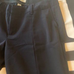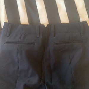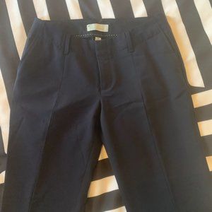 Size 2R, stretch fit, navy blue trousers. Unique seam down front of pant leg. Notched waistband.