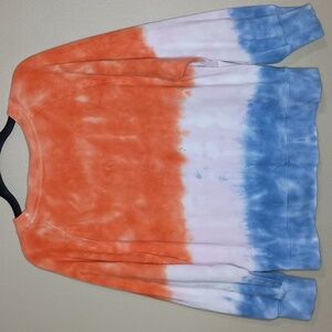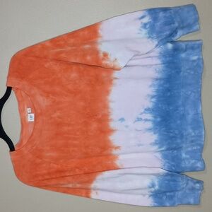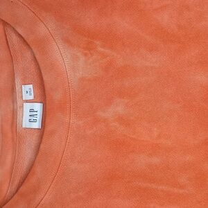 Gap Tye Dye Ombre Sweatshirt in Orange, Pink and Blue. Has some small black spots on the back, see the 4th and 5th photos. I have not tried to get them out. Otherwise Excellent Condition.