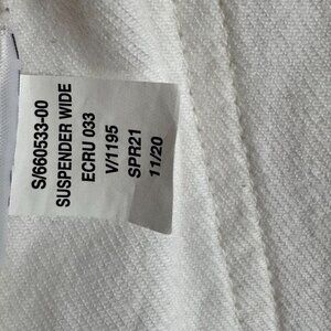 These Wide-Leg Suspender Jeans With Washwell by Gap are constructed in 71% Cotton, 29% Modal white/ ecru denim fabric. There feature a adjustable removable suspender/ braces, silver tone meatl hardware, high waist, 2 slant front pickets, 2 back classic patch pockets and loose fit wide legs. These are retro, menswear inspired, coastal, coastal cowgirl, minimalist, neutral, beachy, diane keaton, 70s vibes.