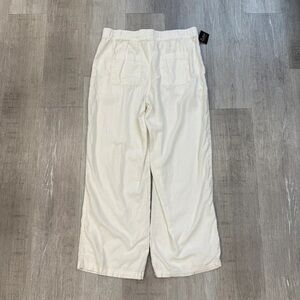 These pants have a drawstring waistband, have 2 front pockets, have 2 back pockets, are full length and are made of a linen fabric blend. Size Large.