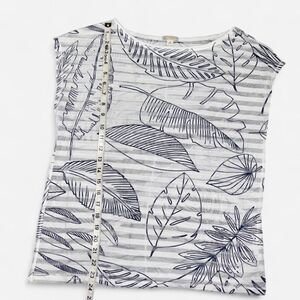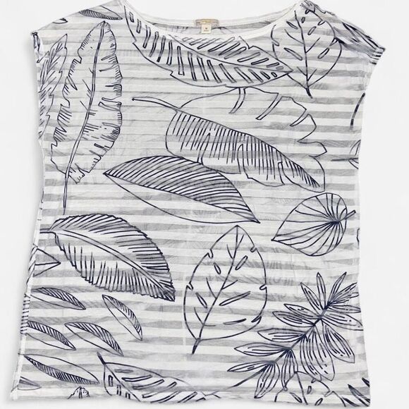 White and Navy blue striped Gap lightweight t-shirt with sheer stripe panels and large leaf prints in size WOMENS MEDIUM. Great gently used condition! Such a beautiful shirt to dress up or wear casually over a cami or bralette!