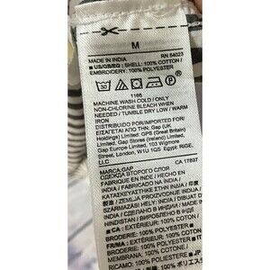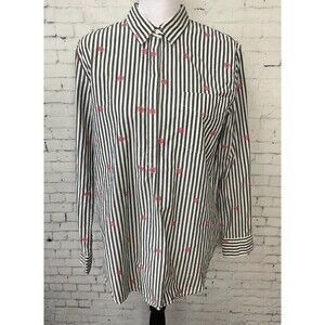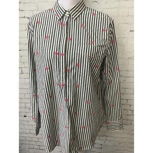 This beautiful Gap women's shirt in gray and white stripes with embroidered pink daisies is perfect for an casual or travel occasion.The classic fit and collared neckline give it a timeless and coastal feel, while the button-up closure and easy-care, lightweight 100% cotton fabric make it practical for everyday wear. Features include pockets, long fitted sleeves, and a flattering tunic style. Ideal for fall, winter, or spring, this shirt is a must-have for any wardrobe.