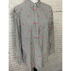 Gap Women Button Up Shirt Gray White Pink Daisy Long Sleeve Classic Fit Sz M H1