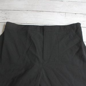 These wool blend maternity dress slacks are solid black. They have a flat front with a zipper, metal fastener and button. They have adjustable side panels that stretch. They are in excellent near to new condition however please know the inside sizing label has a mark on it. They're gorgeous quality and are machine washable.