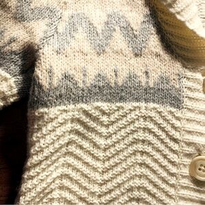 Stay warm and stylish with this cozy knit sweater. Featuring a chic button detail and a blend of cream and grey colors, it's perfect for any occasion.Good condition. One flaw on first button as shown on picture.