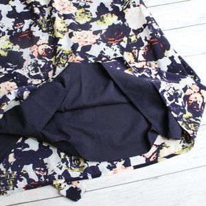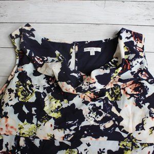 This sleeveless dress is gorgeous. It is off white, dark navy blue, coral orange, chartreuse green, black and tan with a floral pattern. It has a drape neckline with a back button fastener. The waistline has a wide 3 1/2 inch sash that can be tied in front, on the side or in back. The dress is lined with a solid navy blue slip. It is in excellent near to new condition and is such a pretty dress for church, business or a special occasion.