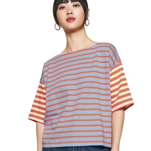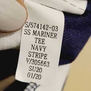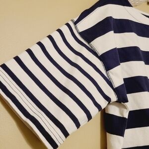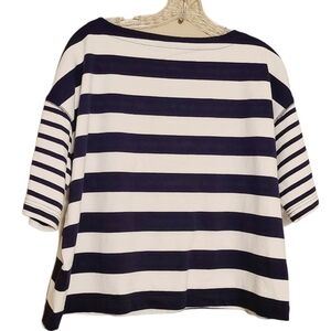 Women's navy and white, boatneck, striped Mariner's coastal 3/4 length sleeves cropped tee by the Gap, size medium. Shirt is in excellent pre-owned condition; no flaws. Stock pic same shirt in different color to show fit.