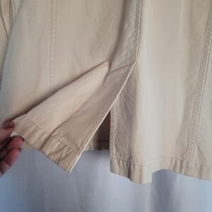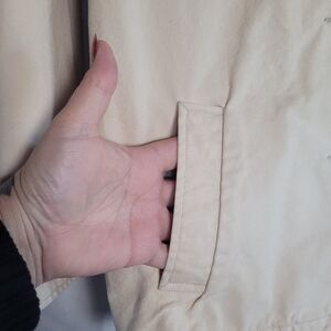 Gap Neutral Tan Heavy Cotton Minimalist Timeless Pea Coat. Women's size large. Has pockets and chest pockets with button closures. Does have 2 small marks near hemline. Also believe it is misssing a tie belt. Measurements are approximate and are shown in photos.