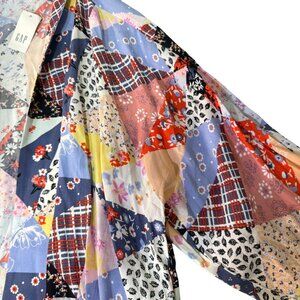 This Gap women's kimono jacket features a vibrant patchwork design and is crafted from 100% rayon. It offers an open front, long sleeves, and a lightweight texture.