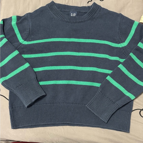 GAP women’s crewneck sweater with bold navy blue and mint stripes. Ideal for casual wear.